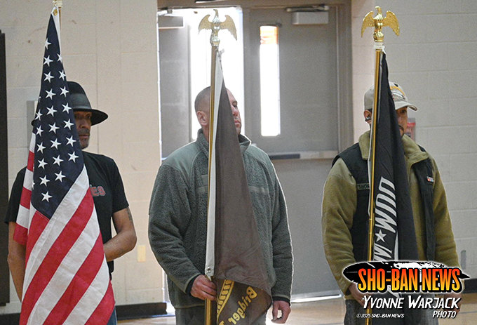 The morning began at 7 a.m. with a sunrise blessing in the school cafeteria, led by Darrell Shay, USMS, and Ron Diaz who took care of the fire. The ceremony opened with a prayer and for the well-being of veterans, families, and the community. Rooted in Shoshone-Bannock tradition, the blessing gave thanks for health, food, and protection while calling for strength and unity among those gathered. (cont.)