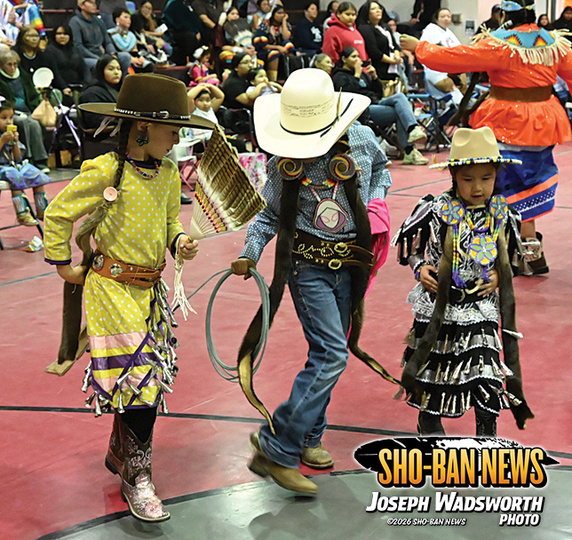 Grand entry began with the Fort Hall Veteran’s Association Color Guard presenting the flags as dancers of all ages entered the area in regalia and formed a circle on the floor. The program included the flag song, victory song, and prayer, welcoming, as community members filled the hall and vendors set up throughout the building. (cont.)
