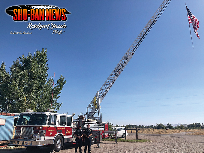 Fort Hall Fire Department raises the American flag off a ladder truck.
