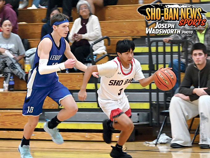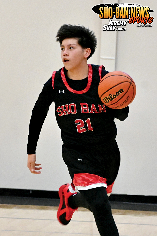 Sho-Ban Chief Terran Good Rider drives the ball against Leadore on Monday, January 12 at home.