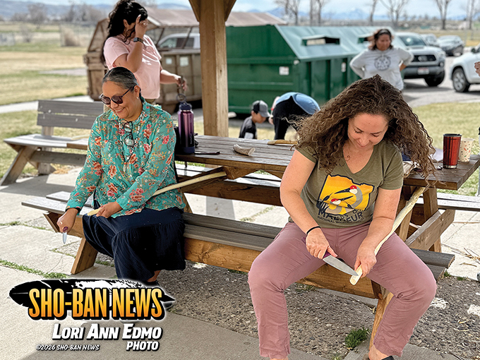FORT HALL — Participants scraped chokecherry wood and attached elk antler for the handle at the Shoshone-Bannock Tribes Language and Culture Preservation Department Poto (digging stick) workshop March 21 at the Shoshone-Bannock Jr./Sr. High School.