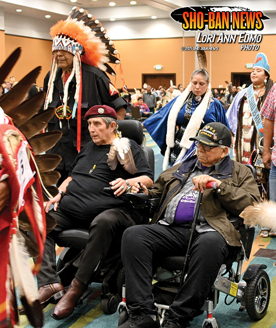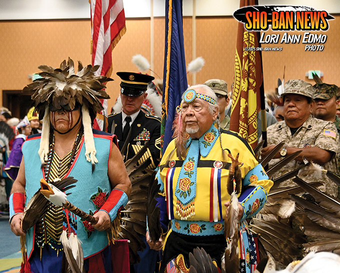 Sho-Ban Veterans in grand entry, front row, from left: Ernie Wahtomy, Michael Sherman